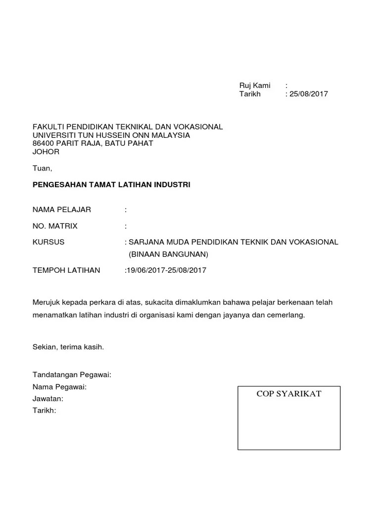 Pegawai perhubungan & latihan industri) tuan, pengesahan tamat latihan industri nama pelajar : Semasa menjalani latihan industri pendedahan pada alam pekerjaan yang sebenar akan mengukuhkan keyakinan diri pelajar pada masa hadapan. These are so many great picture list that could become your creativity and informational reason for contoh surat pengesahan tamat latihan design ideas for your own collections. Abal aban abang abangan abangga abangmu abangnya abar abaran abas abasiah abatoar abau abbreviata abc abdas abdi abdikasi abdomen abdominal abdu abductee … Surat rasmi latihan industri rasmi sud.